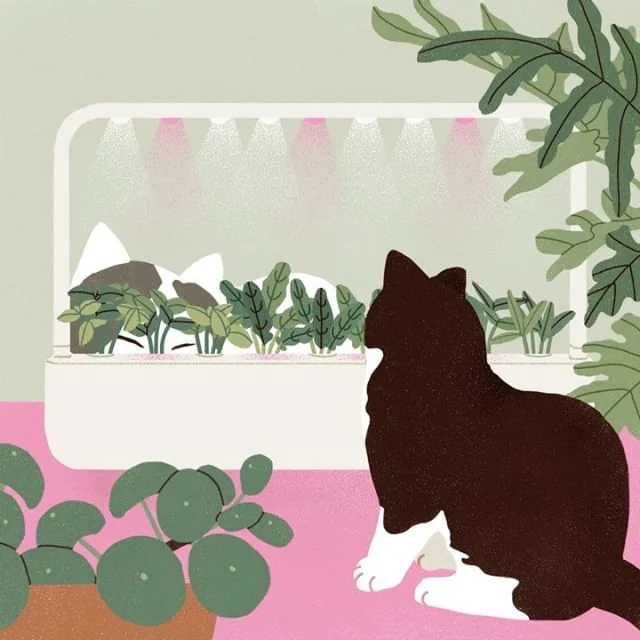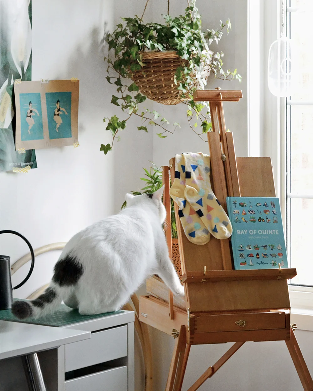 I illustrate in a live-work space in Toronto. I’m in a dedicated studio room that fosters not only my business but all the side-projects I do! It’s full of natural light, quietness for creative thinking and of course it has plants. This space is also shared with my partner and two cats.